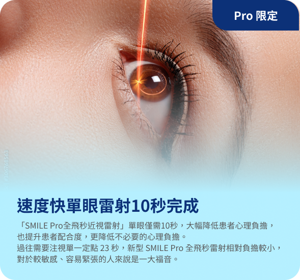 新型SMILEPro 單眼雷射時間只要 8-10 秒。包含前置的消毒以及點麻藥,完整手術時間不到 30 分鐘。