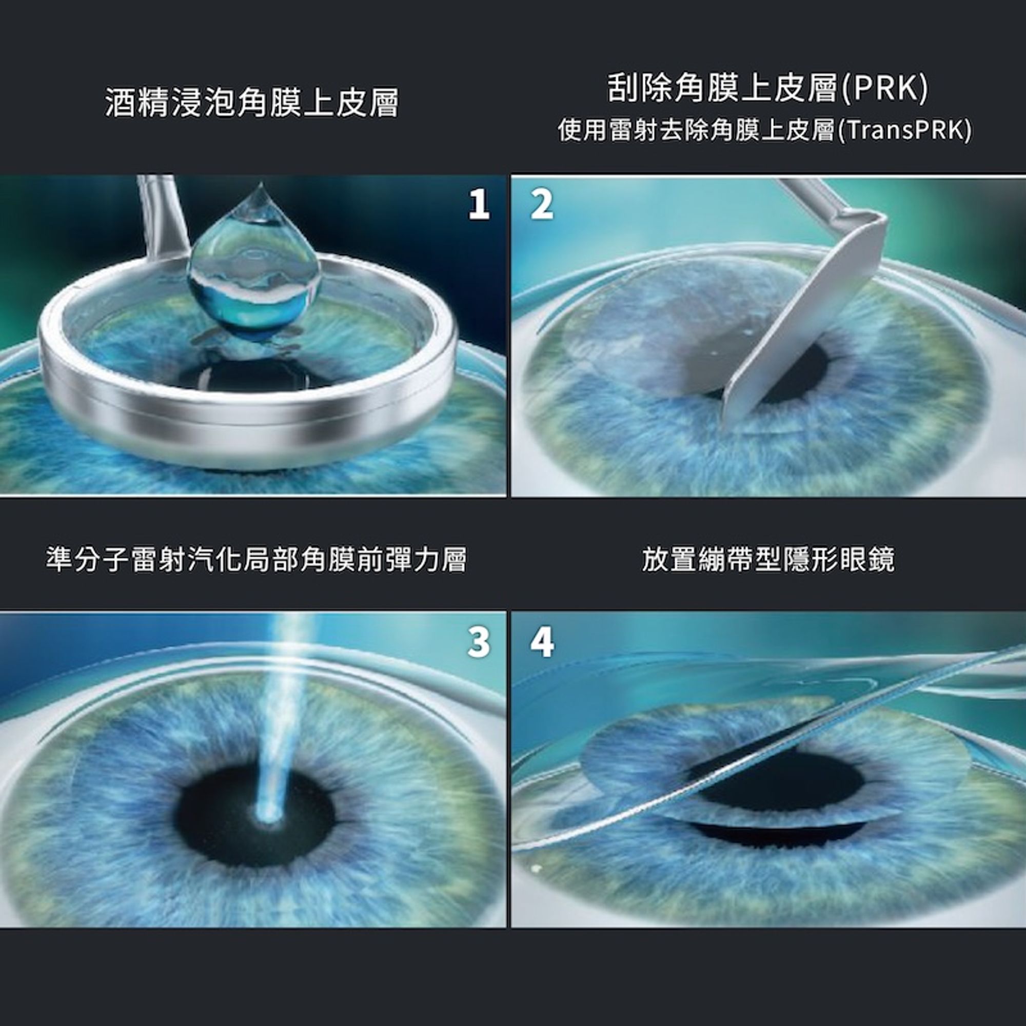 近年來逐漸透過準分子雷射移除角膜上皮細胞彈力層,也就是新型的 Trans-PRK 經上皮雷射屈光角膜削切手術。
