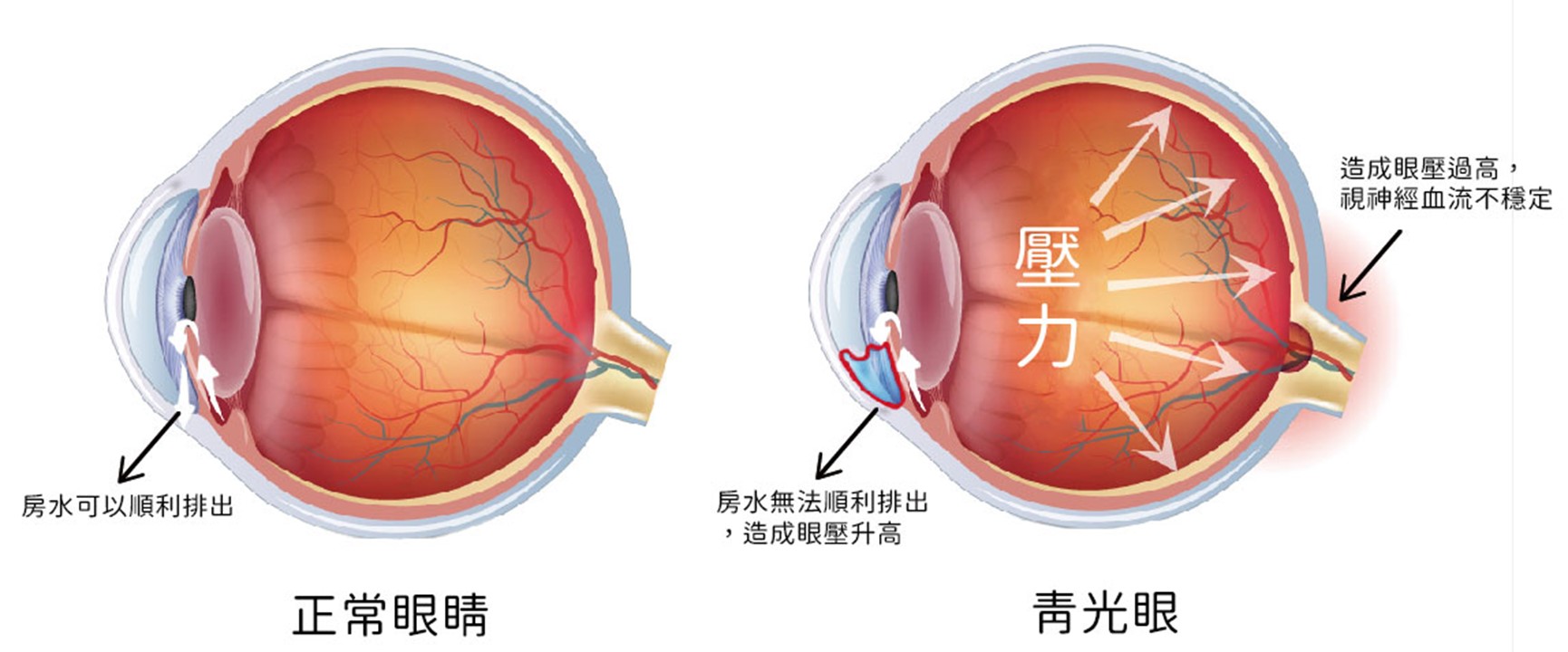 眼睛是藉由平衡房水的分泌與排出維持正常的眼壓,若分泌過多或排出受阻,造成過多的防水在眼球內積蓄,就會導致眼壓升高。