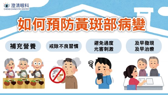 有研究指出,抽菸也可能是導致眼睛黃斑部病變的危害因素之一。另外,舉凡像是三高患者,也必須多多注意飲食、運動習慣並時時控制自己的「健康三高」,保持良好的健康生活才能向黃斑部疾病說掰掰。