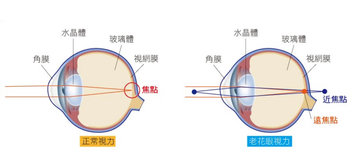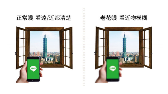 造成眼睛無法對近距離對焦,無法將成像清楚聚焦投影在視網膜上,於是看近物變得吃力、模糊。這就是常見的「老花眼」。