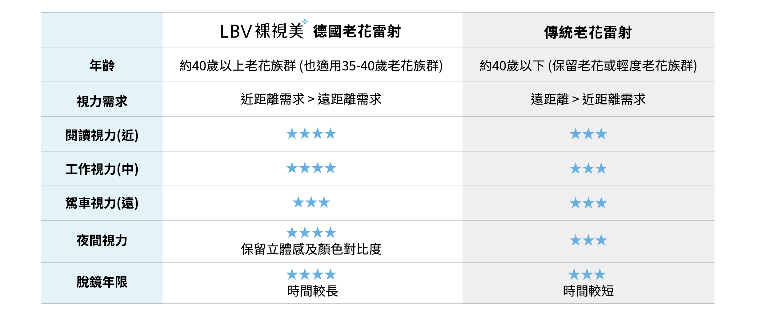 LBV 裸視美兩眼利用「Q質優化」使度數略不同,但兩眼可以融合成像,減少了以往單焦雷射缺點,降低兩眼不等視問題,也讓病人在術後有更好的滿意度。如果想要更完美一併解決近視跟老花問題,可以考慮新型的LBV裸視美老花雷射。