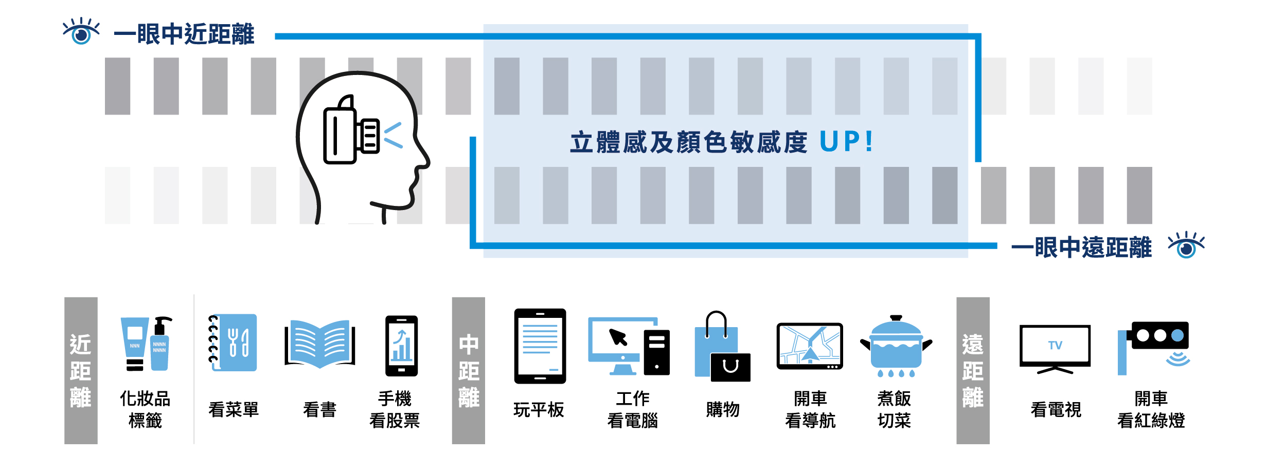 老花、近視、散光可在同一次手術中同步矯正,提升整體景深,讓遠、中、近距離的視力都更加清晰。雙眼具備融像區,減少視差帶來的不適,適應期短、使用更自然。
