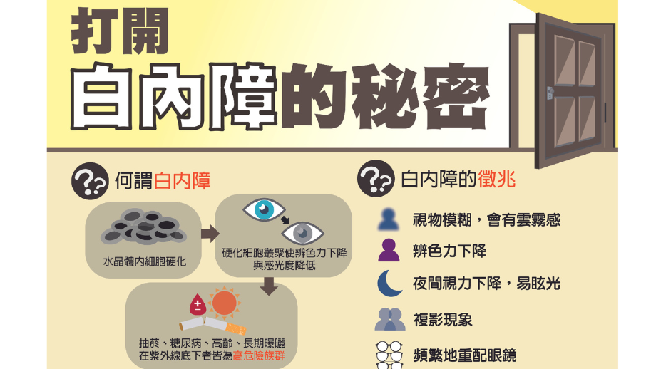 2020/07/24 看遠看近忙、茫、盲,小心可能罹患白內障 白內障是老年人相當常見的眼睛疾病,每個人的情況和程度不一,一般來說共通症狀就是看東西時視力不良、視線模糊,這是因為眼睛的水晶體霧化,擋住了進入眼球的光線,導致患者看不清楚,白內障常見的症狀包括:夜間開車時光暈變大、白天畏光等等。 MORE